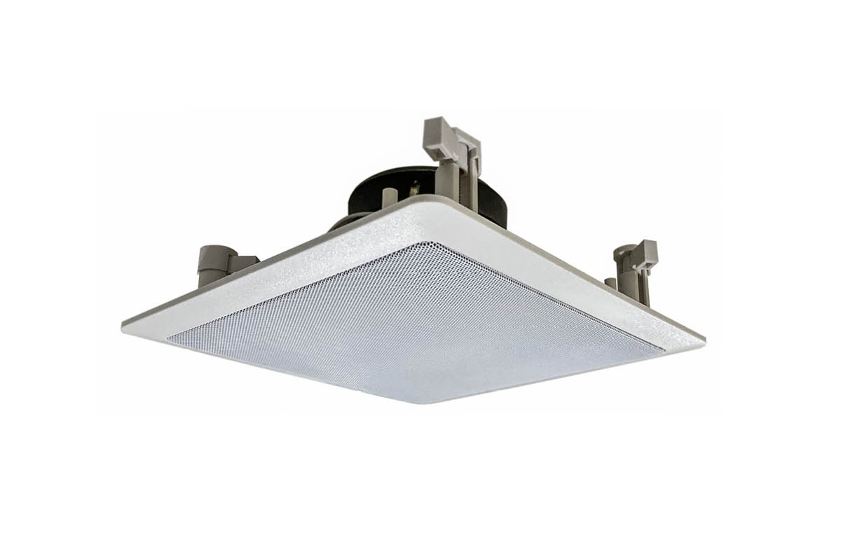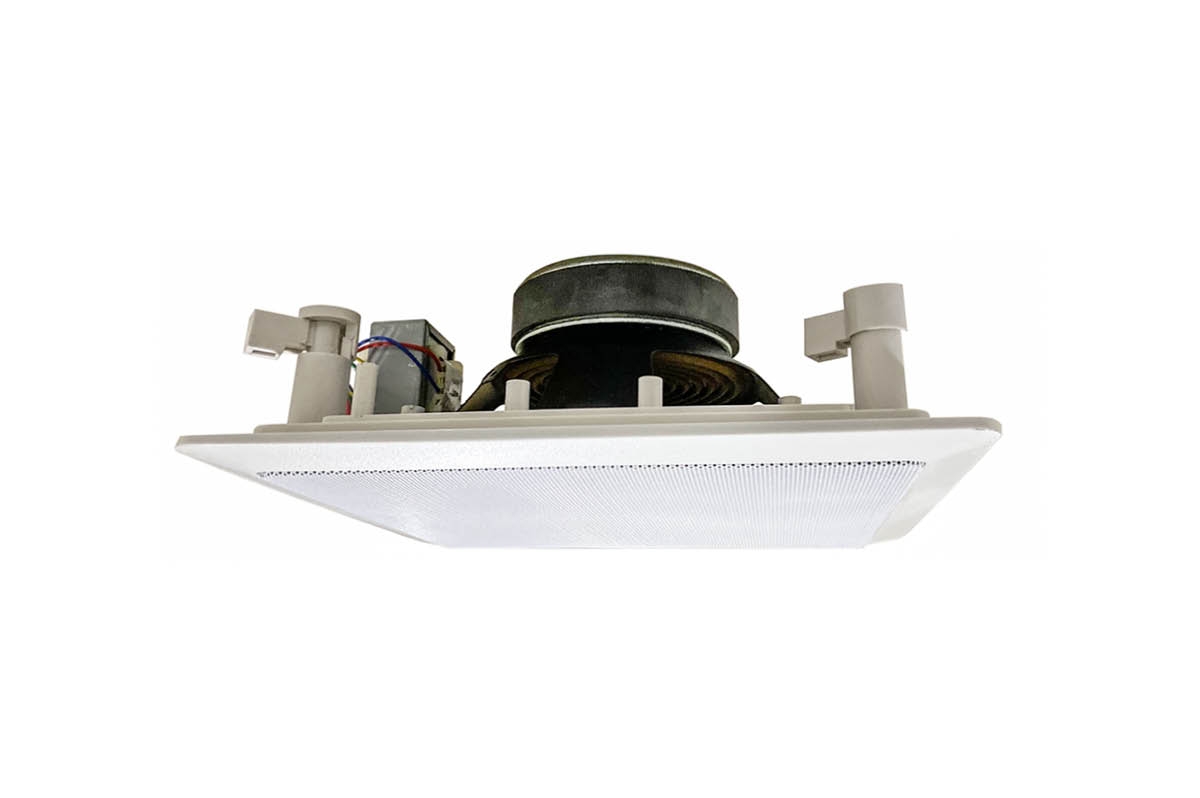 Корпус SCS-40T имеет квадратную форму, повторяющую форму плитки подвесного потолка. Материал корпуса ABS-пластик, динамик защищает мелкоячеистая металлическая сетка. Габаритные размеры 255х255х100 мм, вес 2.2 кг. Монтаж встраиваемый в подвесной потолок, размеры монтажного отверстия 225х225 мм. Белый цвет.