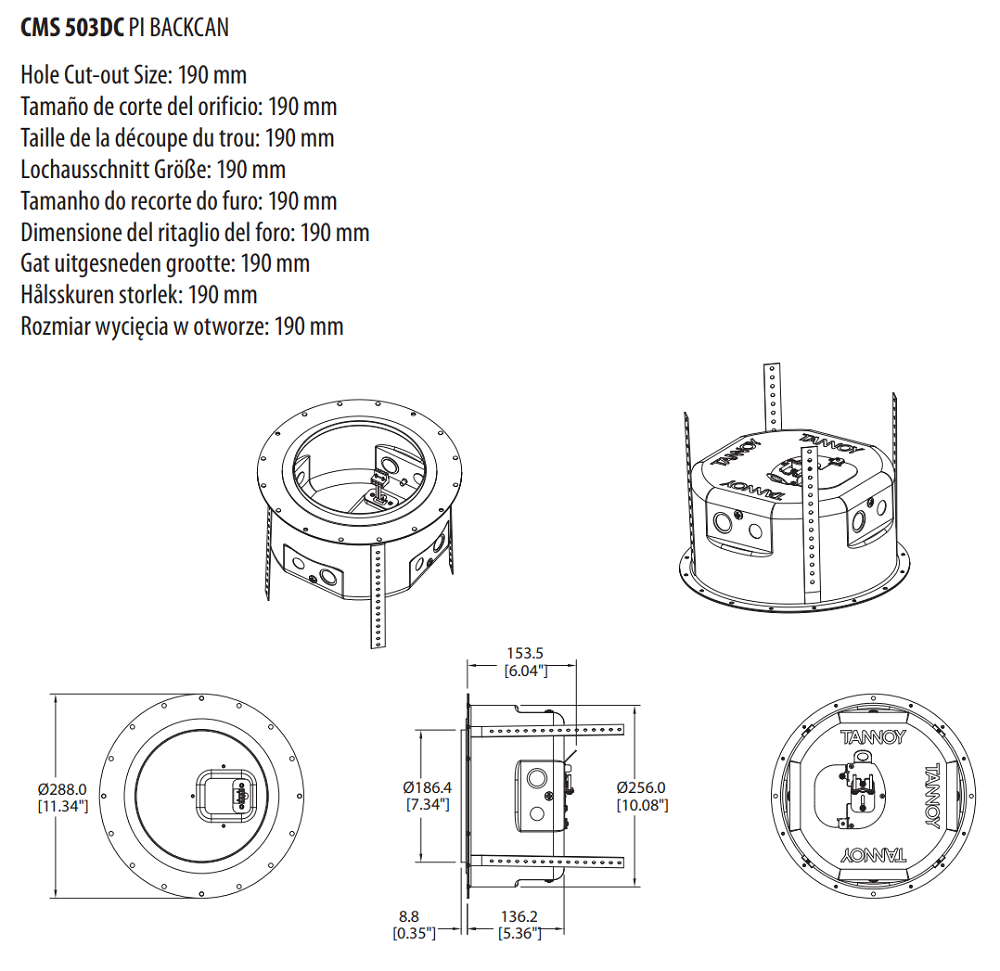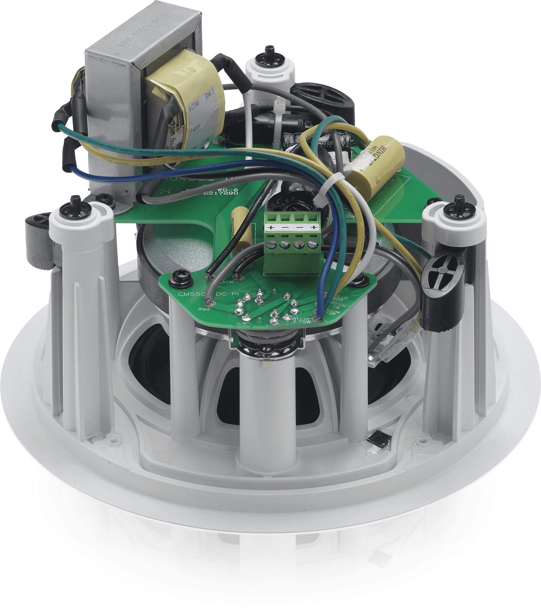 На задней части АС размещён съёмный герметичный блок клеммных аудиоразъёмов. Корпус выполнен из ABS-пластика (тип UL 94V-0), передняя часть надёжно защищена от пыли и влаги решеткой из стали с антиводным покрытием. Для установки в подвесной потолок и защиты корпуса сзади необходимо приобрести монтажный короб/задний колпак из оцинкованной стали BACKCAN CMS 503 PI.