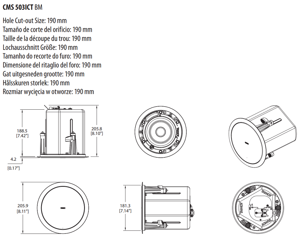 На задней части АС размещён съёмный герметичный блок клеммных аудиоразъёмов. Корпус выполнен из ABS-пластика (тип UL 94V-0), передняя часть надёжно защищена от пыли и влаги решеткой из стали с антиводным покрытием, а сзади корпус скрыт защитным колпаком из оцинкованной стали. Габаритные размеры Ø205,9x188 мм, вес 3,95 кг. Монтаж встраиваемый в подвесной потолок. Соответствует UL 1480, UL 2043.