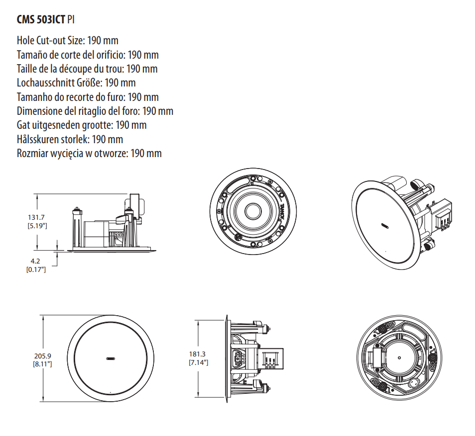 На задней части АС размещён съёмный герметичный блок клеммных аудиоразъёмов. Корпус выполнен из ABS-пластика (тип UL 94V-0), передняя часть надёжно защищена от пыли и влаги решеткой из стали с антиводным покрытием. Для установки в подвесной потолок и защиты корпуса сзади необходимо приобрести монтажный короб/задний колпак из оцинкованной стали BACKCAN CMS 503 PI.