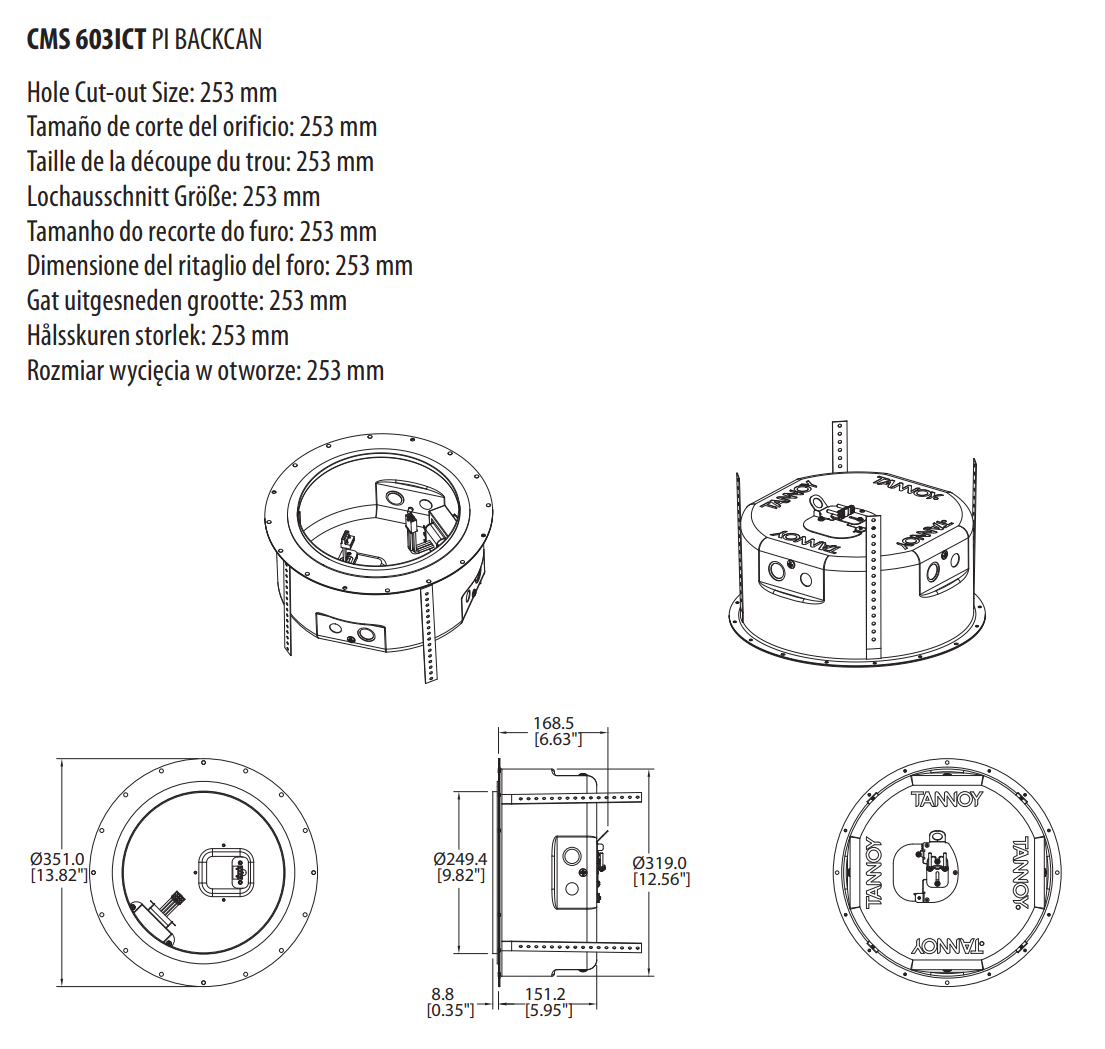 На задней части АС размещён съёмный герметичный блок клеммных аудиоразъёмов. Корпус выполнен из ABS-пластика (тип UL 94V-0), передняя часть надёжно защищена от пыли и влаги решеткой из стали с антиводным покрытием. Для установки в подвесной потолок и защиты корпуса сзади необходимо приобрести монтажный короб/задний колпак из оцинкованной стали BACKCAN CMS 603 PI.