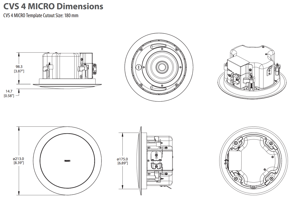Задняя часть АС помещена под колпачок из стали, который служит функции защиты от огня + от пагубного воздействия пыли и влаги. Передняя часть АС защищена решёткой из нержавеющей стали, покрытой матовым порошковым окрасом белого цвета. Корпус выполнен из ABS-пластика (тип UL 94-V0). Соответствует UL-1480, сертифицирован EN54-24, может применяться в составе систем пожарного оповещения. Габаритные размеры Ø213 x 98 мм (сверхмалая глубина посадки), монтажное отверстие Ø180 мм, вес 2,8 кг. Установка встраиваемая в подвесной потолок, крепление на шарнирные зажимы.