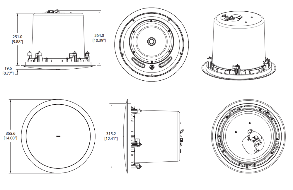 Задняя часть АС помещена под колпачок из оцинкованной стали, который служит функции защиты от огня + от пагубного воздействия пыли и влаги. Передняя часть АС защищена решёткой из нержавеющей стали, покрытой матовым порошковым окрасом белого цвета. Корпус выполнен из ABS-пластика (тип UL 94-V0). Соответствует UL-1480, может применяться в составе систем пожарного оповещения. Габаритные размеры Ø356 x 251 мм (монтажное отверстие Ø320 мм), вес 6,6 кг. Установка встраиваемая в подвесной потолок, крепление на шарнирные зажимы.