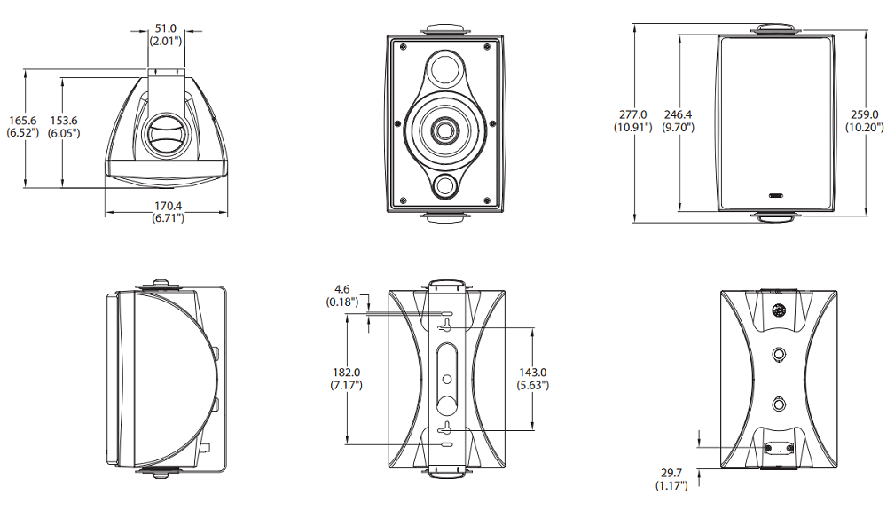Габаритные размеры 277x171x166 мм, вес 2,8 кг. Монтаж настенный на U-кронштейн в комплекте. АС покрыта матовым порошковым окрасом белого цвета.