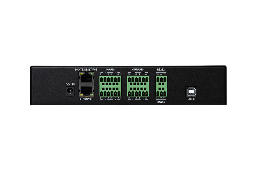 ITDSP-0404Dv2 имеет поддержку аудио Dante / AES67 4x4 каналов, управление через отдельный порт Ethernet.