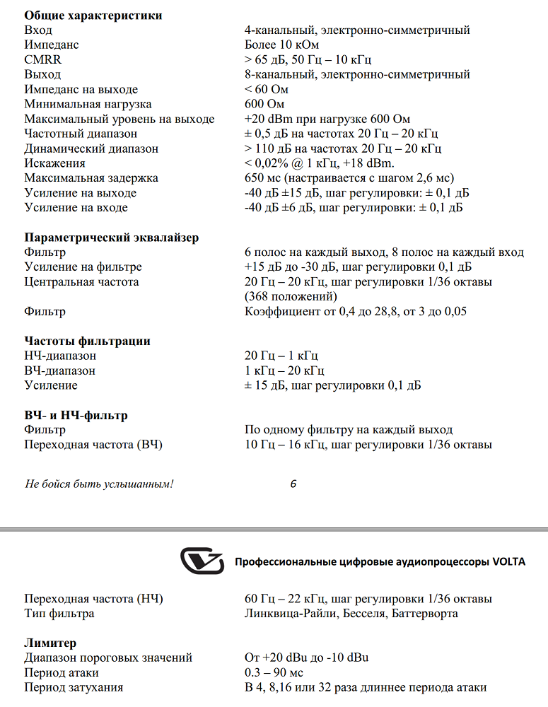 Цифровой аудиопроцессор DSP 240 PRO - профессиональное устройство для цифровой обработки аналоговых акустических сигналов и управления подключёнными аудиоприборами с целью оптимальной настройки воспроизведения звука. Встроенный DSP оснащён мощным продвинутым чипом, параметры дискретизации: 32 бит с плавающей, 96 кГц. Устройство эксплуатируется в музыкально-речевых системах для концертов, клубов, конференций, выставок, различных публичных мероприятий, лекций, видеоконференций и т.п. Идеально сочетается с профессиональной активной акустикой VOLTA.