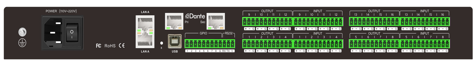 Богатое оснащение входными и выходными каналами. Аналоговые: 16 входов, комбинированные (микрофонно-линейные); 16 выходов (с фантомным питанием +48В). Цифровые представлены двумя типами: Dante/AES67 64х64 (всего 128 каналов, есть основной и резервный входы) и USB 8х8 (всего 16). На лицевой панели размещен информативный дисплей отображающий текущий режим работы прибора.