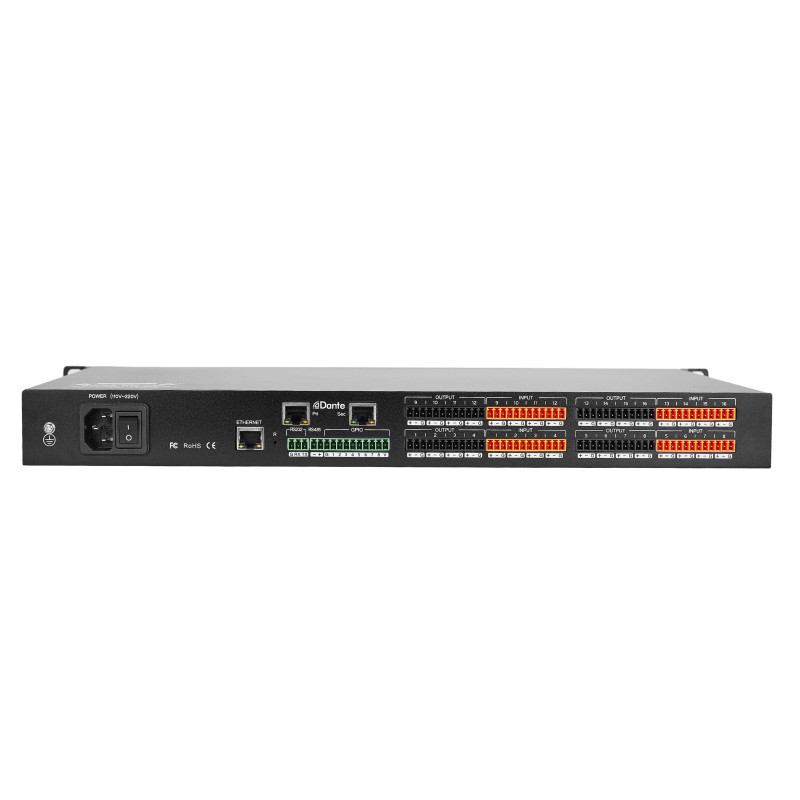 Прибор оборудован шестнадцатью (16) аналоговыми входами, каждому из которых соответствуют следующие возможности для обработки звука: предусиление сигнала (до 18 дБ), генератор сигнала, экспандер, компрессор и параметрический эквалайзер на 5 секций. Шестнадцать (16) аналоговых выходов и для каждого предусмотрен: 31-секционный параметрический эквалайзер, настройка времени задержки передачи сигнала со входа, лимитер и делитель частоты. Максимальное усиление аналогового сигнала 51 дБ. Помимо аналоговых сигналов, устройство работает и с цифровыми, обмен которыми производится по протоколам Dante/AES67. Модуль Dante содержит соответствующие каналы, которые составляют матрицу 16 х 16 (16 входов и 16 выходов).