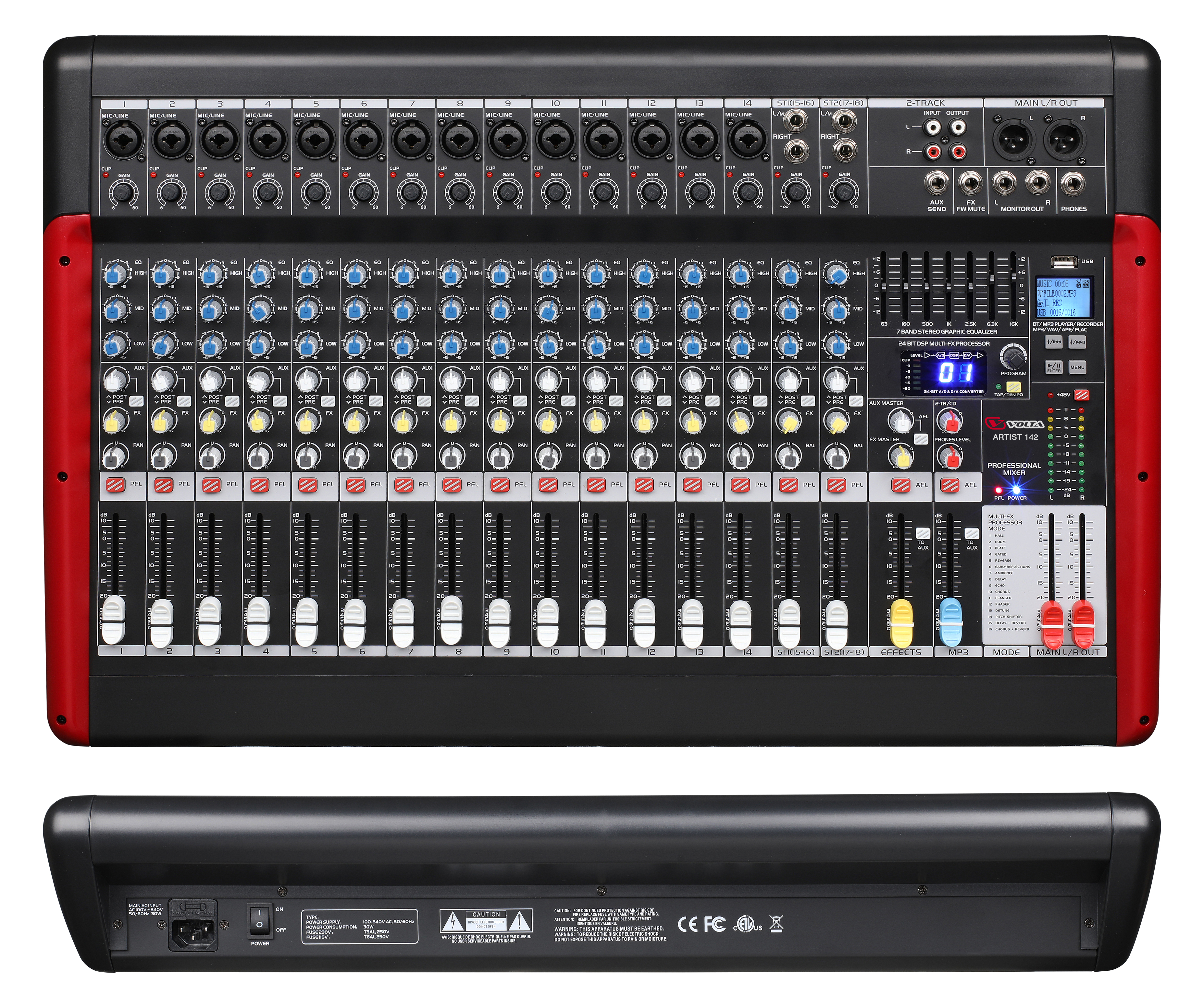 Высокоэффективный цифровой 24-х битный процессор эффектов DSP имеет 16 пресетов, подобранных для разнообразных акустических ситуаций встречающихся при работе с пультом. Процессор позволяет создать звуковую палитру микса наиболее точно отвечающую требованиям к музыке в моменте. Встроенный медиаплеер с возможностью воспроизведения файлов формата MP3, WAV и FLAC с USB-носителя или потокового аудио от гаджета через Bluetooth, обеспечивает автономность и компактность системы с данным прибором в составе. Есть функция записи трансляции на USB-носитель или на внешнее устройство (рекордер).