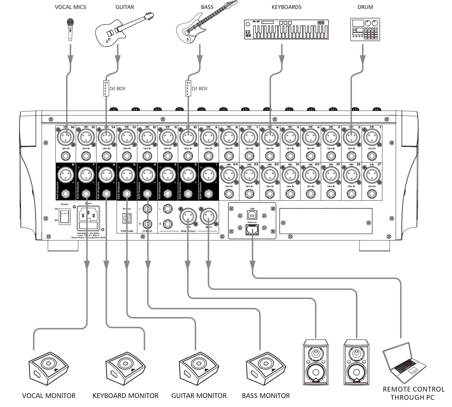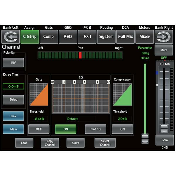 Оснащение. 24 аналоговых входных канала: комбинированные, микрофонно-линейные, разъемы 24х XLR/TRS. У каждого микрофонного входа свой предусилитель с буфером класса A и двойным каскадом усиления, что позволяет добиться сверхнизкого уровня шума и широкого диапазона усиления; возможность подать фантомное питание +48В для микрофонов. У всех аналоговых входов цифровая регулировка усиления. 13 аналоговых выходных каналов: 8 настраиваемых (шины смешанного сигнала или шины MATRIX), микрофонно-линейных, разъемы XLR/TRS; 2 основных или мастер-выхода, разъемы 2х XLR/TRS (L и R); 2 мониторных выхода, разъемы 2х TRS (CTRL OUT, L и R) и выход на наушники с разъемом mini Jack. Опционально доступен модуль DANTE, который поддерживает матрицу 32 x 32 входных/выходных цифровых каналов.