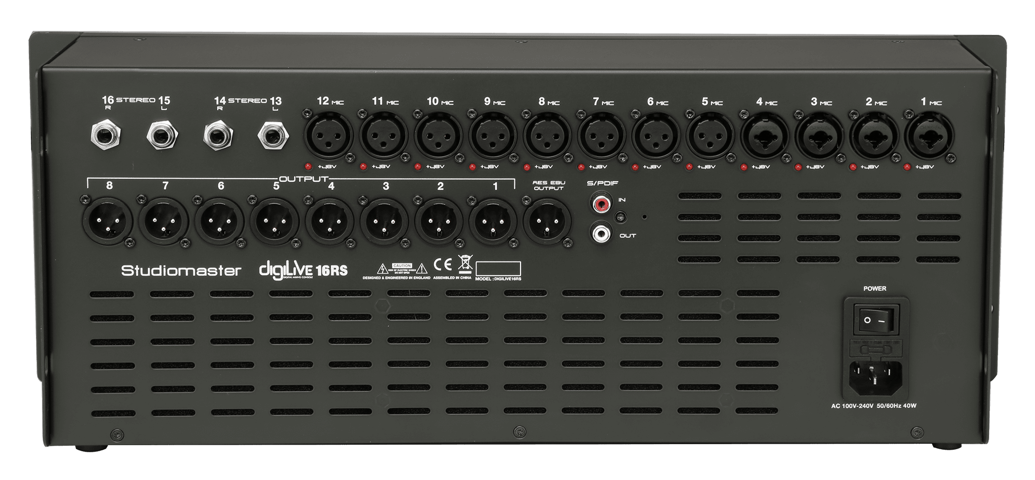 Микшерная консоль DIGILIVE 16RS оснащена большим количеством входных и выходных каналов. Шестнадцать (16) аналоговых входов: 12 микрофонных, балансных, 8 из них на разъемах XLR и 4 на разъемах XLR/TRS; 4 линейных входа, для стереосигналов, реализованы на разъемах 6.5 мм Jack. Для каждого микрофонного входа предусмотрен высококачественный предусилитель, всего 12 штук. Восемь (8) аналоговых выходных канала на балансных разъемах 8х XLR; мониторный выход на наушники 3.5 мм Jack; цифровой выход для передачи данных по протоколам AES/EBU и оптические вход/выход стандарта S/PDIF.