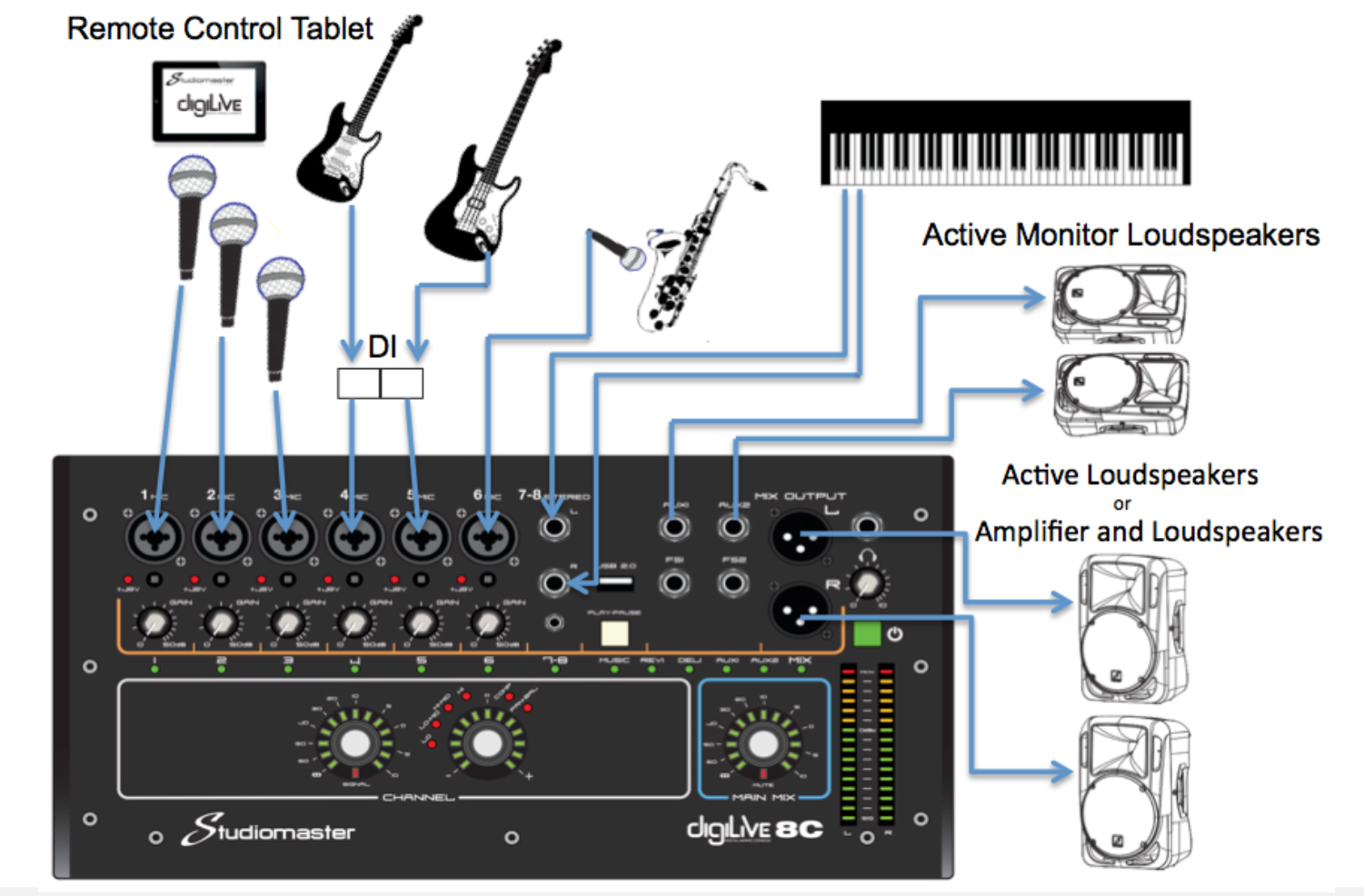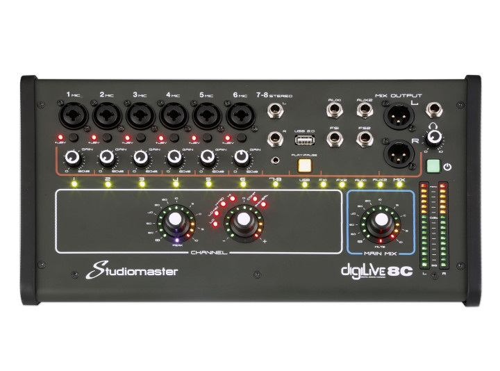 Цифровой микшерный пульт DIGILIVE 8СH разработан компанией Studiomaster с целью обеспечения отличного качества воспроизведения аудиосигналов от различных источников (каналов) смешивая их и обрабатывая в процессе. Переносной микшерный пульт подходит для клубных или фестивальных выступлений DJ, для проведения выездных мероприятий, при онлайн трансляциях/стримах/записи видеороликов, для репетиций на студиях звукозаписи и т.п.
