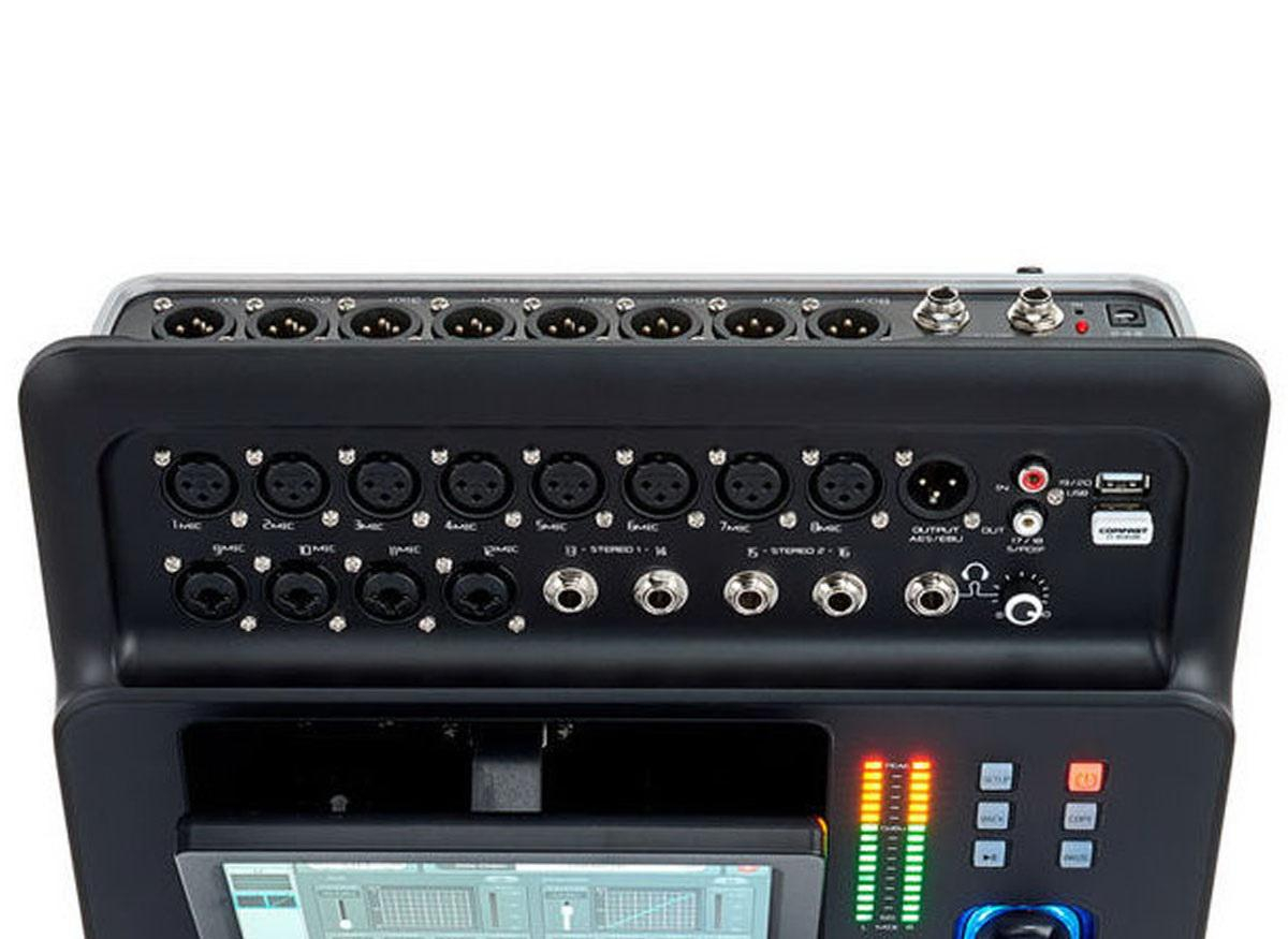 Оснащение. 16 аналоговых и 4 цифровых входных канала. Цифровые каналы подаются через стереовходы S/PDIF и USB. Аналоговые каналы делятся на микрофонные, стерео и комбинированные входы. Стереовходы реализованы на разъемах 4х TRS (по 2 L и R); для микрофонных использованы разъемы 8х XLR; комбинированные, микрофонно-линейные, коннекторы 4х XLR/TRS. У каждого микрофонного входа свой предусилитель с буфером класса A и двойным каскадом усиления, что позволяет добиться сверхнизкого уровня шума и широкого диапазона усиления; есть возможность подать на микрофон фантомное питание +48В. Для микрофонных составляющих комбинированных входов предусмотрен переключатель между низким входным сопротивлением и высоким. В режиме высокого входного сопротивления к микрофонному входу можно подключить высокоомный источник сигнала, например, электрогитару.