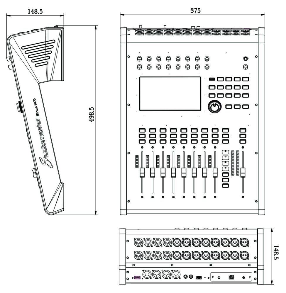 Прибор работает на базе операционной системы Android. Для управления предусмотрены 9 моторизованных фейдеров 100 мм, энкодер и несколько кнопок. Сенсорный экран с диагональю 7" и разрешением 1024х600px позволяет проводить наглядные настройки. Также возможно дистанционное управление с помощью специализированного приложения для iOS / Android (гаджет подключается по Wi-Fi) или же с ПК используя API (подключение через порт RS-485). Прибор выполнен в фирменном черном цвете компании Studiomaster, настольный форм-фактор. Габаритные размеры 375x498.5x148.5 мм, вес 7.5 кг. Питание через блок питания от сети 220В.