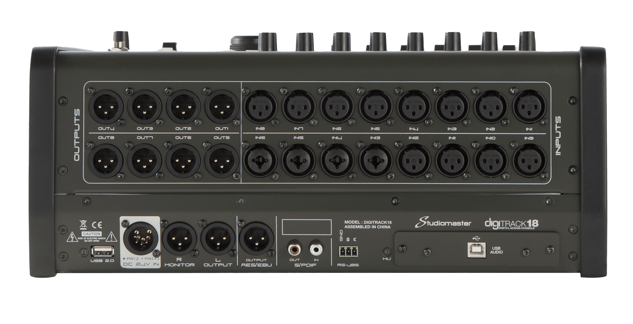 Микшерная консоль DIGITRACK18 оснащена большим количеством входных и выходных каналов. Двадцать (20) аналоговых входов: 12 микрофонных, балансных, на разъемах 12х XLR и 4 комбинированных, стерео, на разъемах 4х XLR/TRS. Для каждого входа предусмотрен высококачественный предусилитель студийного уровня и класса А, всего 16 штук. Восемь (8) аналоговых выходных канала с возможностью конфигурации каждого из них: 2 мастер-выхода + 6 AUX (разъемы 8х XLR); мониторные выходы 2х XLR и выход на наушники 3.5 мм Jack; цифровой выход для передачи данных по протоколам AES/EBU и оптические вход/выход стандарта S/PDIF. Особенностью данного микшерного пульта является интегрированный модуль для передачи цифровых каналов звука по USB - 16 x 16 матрица входных/выходных каналов.