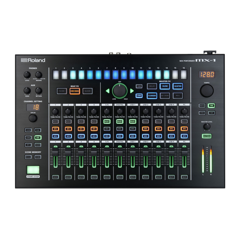 Roland MX-1 представляет собой портативный цифровой микшерный пульт на 18 каналов в общей сложности. Прежде всего данная модель оборудована высококачественным эффект-процессором, который включает в себя большой инструментарий самых необходимых обработок. Так же пульт оборудован встроенным аудиоинтерфейсом, который в свою очередь существенным образом расширяет границы его возможностей и позволяет микшеру работать в нескольких основных режимах. Прежде всего он может работать как традиционная цифровая консоль без необходимости в дополнительных внешних устройств. Так же он способен работать в режиме полноценного и многоканального аудиоинтерфейса в совокупности со всеми основными музыкальными редакторами. Но что еще интересней, пульт вполне может работать в режиме традиционного MIDI-контроллера и управлять программными микшерами во время записи или воспроизведения.