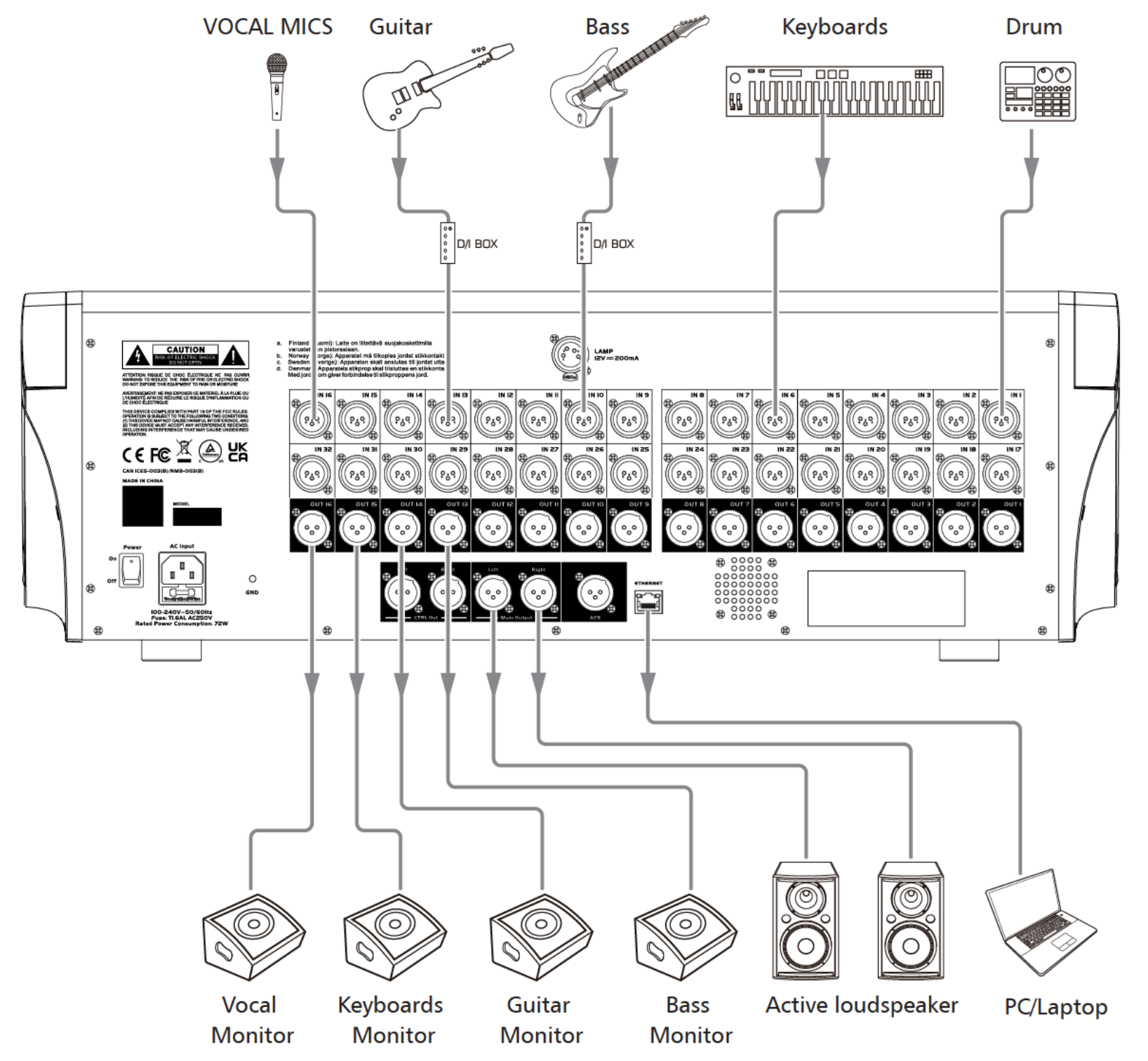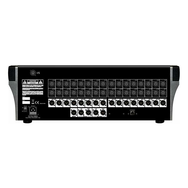 Оснащение. 32 аналоговых и 32 цифровых входных канала. Микрофонные входы реализованы на разъемах XLR, у каждого из них свой предусилитель с буфером класса A и двойным каскадом усиления, что позволяет добиться сверхнизкого уровня шума и широкого диапазона усиления. Предусмотрена цифровая регулировка усиления и возможность подать на микрофон фантомное питание +48В. Цифровые каналы передаются с помощью Ethernet посредством разъема RJ-45. 21 аналоговый выходной канал: 16 настраиваемых, 16 шин BUS и 8 шин MATRIX, разъемы XLR; 2 основных или мастер-выхода, разъемы 2х XLR (L и R); 2 мониторных выхода, разъемы 2х XLR (CTRL OUT, L и R) и выход на наушники с разъемом mini Jack. Все входные каналы могут быть назначены на контрольные выходы и/или выход на наушники. Опционально доступен модуль DANTE, который поддерживает матрицу 32 x 32 входных/выходных цифровых каналов.