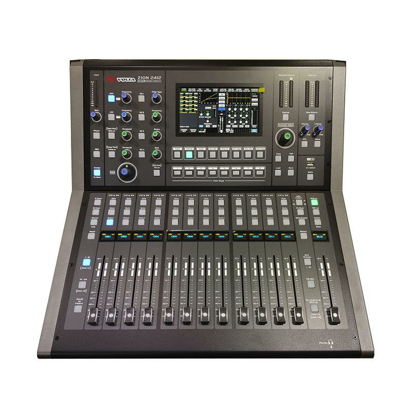 Профессиональный микшерный пульт Zion 2412 обладает стильным, высокотехнологичным и современным дизайном; корпус с наклоном для удобства пользователя. Помимо множества регуляторов присутствуют 13 моторизованных прецизионных фейдеров 100 мм, сенсорный полноцветный ЖК-дисплей с диагональю 7" для работы со встроенным меню и настройками DSP, и небольшой двухцветный ЖК-дисплей для отображения информации о канале. Через порт USB можно вести запись трансляции. Подключение к сети, как уже указывалось, с помощью разъема RJ-45. Возможно дистанционное обновление прошивки и управление пультом с помощью iPad, если локальная сеть выведена через Wi-Fi. ПО в комплекте.