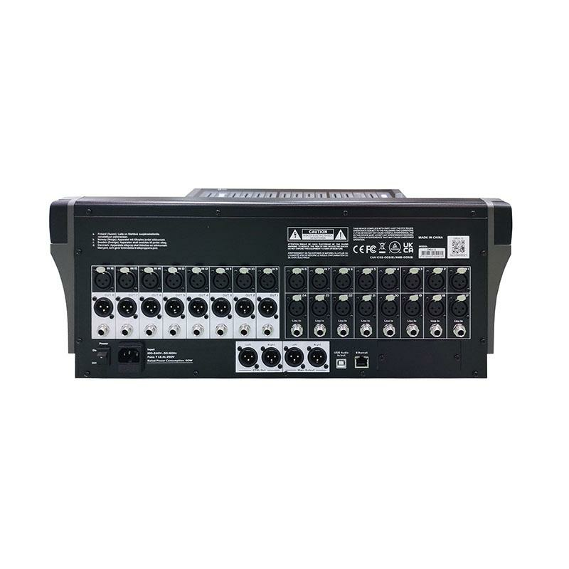 Оснащение. 24 аналоговых и 32 цифровых входных канала. Аналоговые: 16 микрофонных, разъемы XLR, и 8 микрофонно-линейных, разъемы XLR/TRS. У каждого микрофонного входа свой предусилитель с буфером класса A и двойным каскадом усиления, что позволяет добиться сверхнизкого уровня шума и широкого диапазона усиления; возможность подать фантомное питание +48В для микрофонов. У всех аналоговых входов цифровая регулировка усиления. Цифровые каналы передаются с помощью Ethernet посредством разъема RJ-45. 13 аналоговых выходных каналов: 8 настраиваемых (шины смешанного сигнала или шины MATRIX), микрофонно-линейных, разъемы XLR/TRS; 2 основных или мастер-выхода, разъемы 2х XLR (L и R); 2 мониторных выхода, разъемы 2х XLR (CTRL OUT, L и R) и выход на наушники с разъемом mini Jack. Опционально доступен модуль DANTE, который поддерживает матрицу 32 x 32 входных/выходных цифровых каналов.