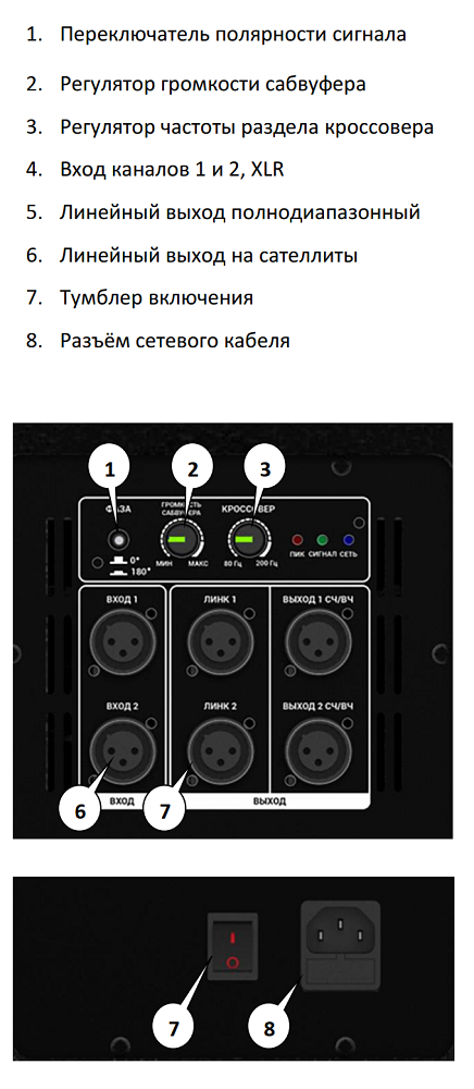 | Разъемы выход: | 2х XLR Link, 2х XLR (кроссовер) |