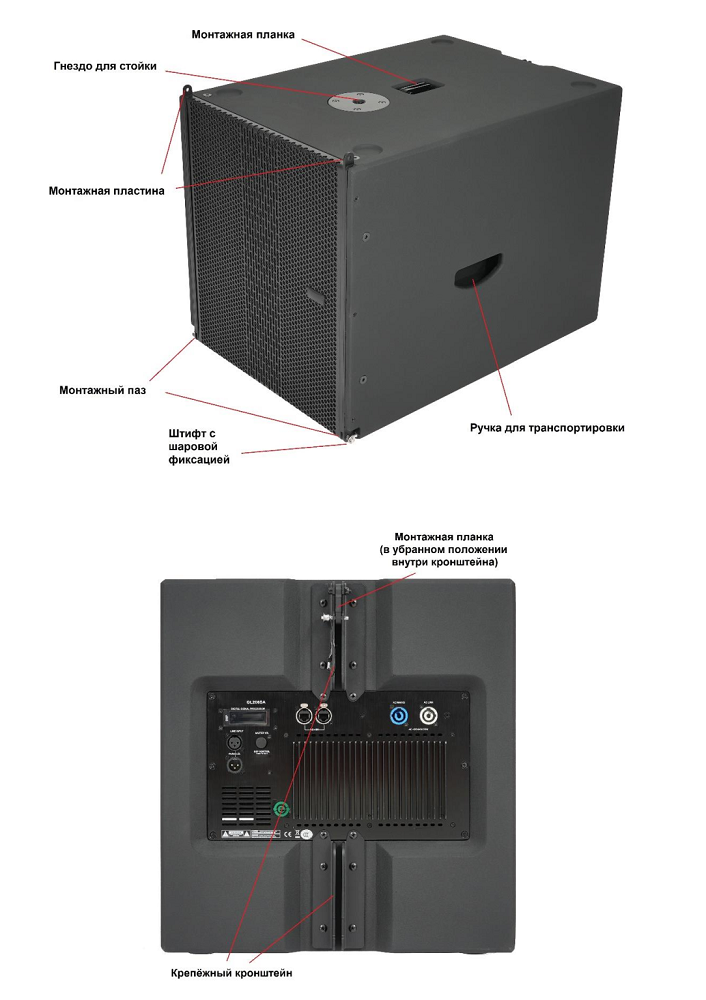 | Монтаж: | подвесной, напольный (в стек) или с использованием акустической стойки саб/сат, все компоненты для монтажа интегрированы в корпус |