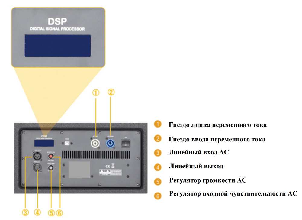 Линейный аудиовход для подключения источника звука реализован на балансном разъеме XLR. Линейный аудиовыход XLR Parallel для подключения следующего элемента линейного массива с целью трансляции одного и того же сигнала. Питание от сети 220В с параллельным выходом "AC Link" для передачи электроэнергии следующему элементу линейного массива. Все разъемы, элементы управления и дисплей расположены на тыльной части корпуса.