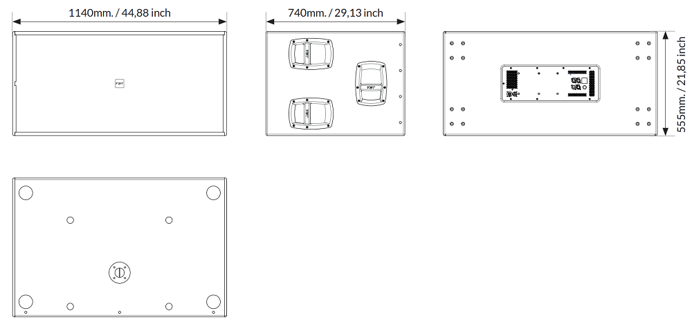 Корпус выполнен из многослойной березовой фанеры толщиной 18 мм и покрыт стойкой к царапинам краской; для уменьшения резонанса и турбулентности воздуховодов конструкция оптимизирована с помощью акустического моделирования типа BEM. Стальная решетка с порошковым окрасом защищает лицевую часть. Черный цвет, габаритные размеры 1150х800х830 мм, вес 83 кг. Монтаж напольный, элементы линейного массива могут крепиться к сабвуферу на специальные рамы. Питание AC 220В. Шесть ручек для переноса.