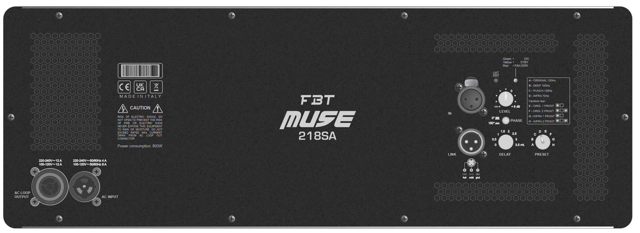 Оснащение MUSE 218SA. Два (2) динамика: НЧ-вуферы диаметром восемнадцать дюймов (18") со звуковой катушкой 3,5" (B&C) и неодимовым магнитом. Встроенный усилитель с топологией класса D обладает мощностью RMS 4000 Вт (пиковая 8000 Вт). Цифровой процессор обработки звука DSP с восемью пресетами; возможна регулировка громкости и задержки, есть переключатели фазы и GRND switch. Коннекторы: XLR In/Out.
