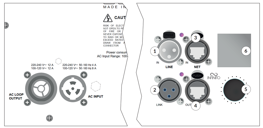 | DSP: | встроенный, 8 пресетов; управление через ПО Infinito |