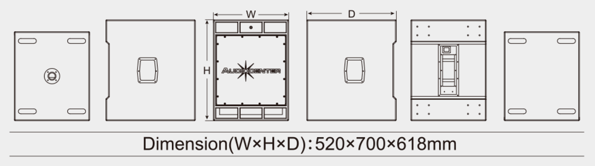 Динамик защищен сплошной стальной перфорированной сеткой. Корпус выполнен из фанеры. В корпусе расположен стакан для крепления стандартных стоек Ø 35мм, а на задней части есть отверстия М20 для подвеса. Также сабвуферы можно класть друг на друга и монтировать на кронштейн. По бокам есть ручки для переноса.
