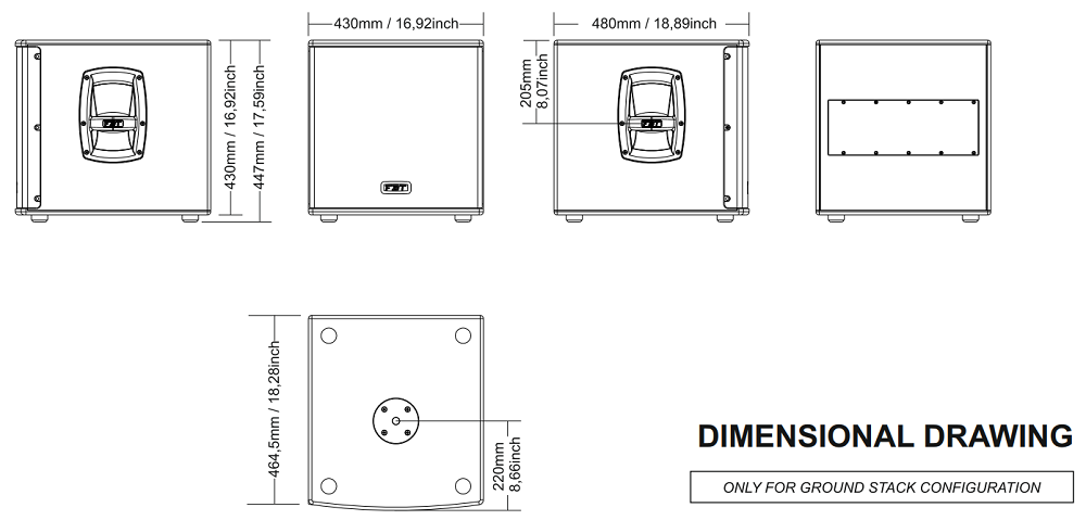Корпус выполнен из многослойной березовой фанеры толщиной 15 мм, стальная решетка с порошковым окрасом черного цвета защищает лицевую часть. Габаритные размеры 430x447x480 мм. Легкий! Вес всего 23 кг. Монтаж напольный, с целью крепления сателлитов сверху корпуса предусмотрен стакан М20 для акустических стоек. Питание AC 220В.