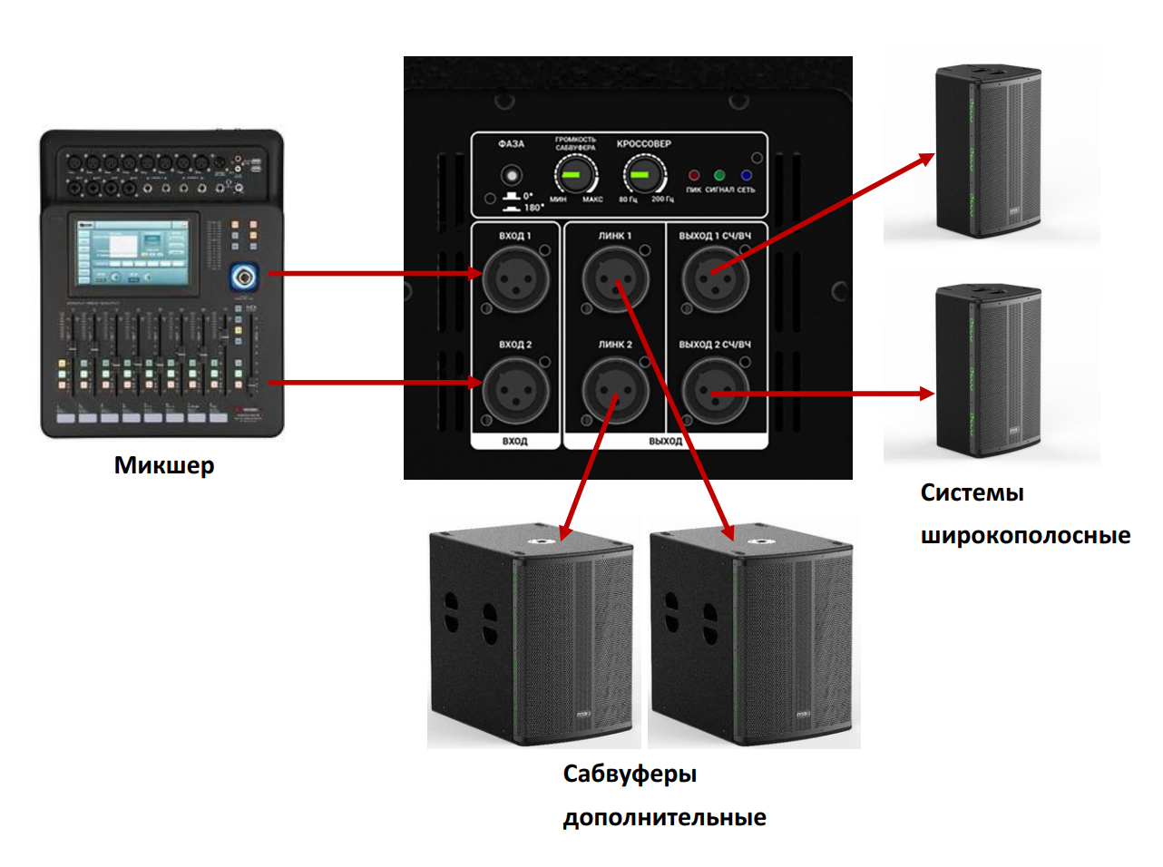 | Разъемы выход: | 2х XLR Link, 2х XLR (кроссовер) |