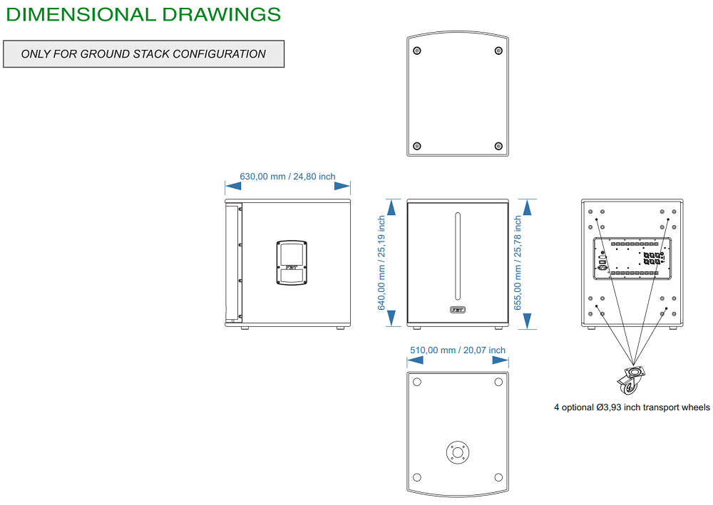Корпус выполнен из многослойной фанеры толщиной 15 мм, стальная сетка с порошковым окрасом черного цвета защищает лицевую часть. Габаритные размеры 510x655x530 мм, вес 34 кг. Монтаж напольный, сверху корпуса предусмотрен стакан М20 для акустических стоек. Питание AC 220В.