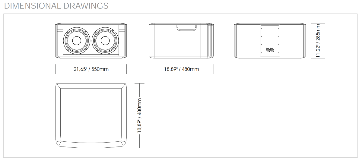 Корпус выполнен из многослойной березовой фанеры толщиной 15 мм, стальная решетка с порошковым окрасом защищает лицевую часть. На тыльной стороне расположены 2 коннектора Neutrik Speacon. Габаритные размеры 550х285х480 мм, вес 18 кг. Монтаж настенный, предусмотрены резьбовые точки М5/М10. Для удобства переноса есть 2 ручки. Черный цвет.