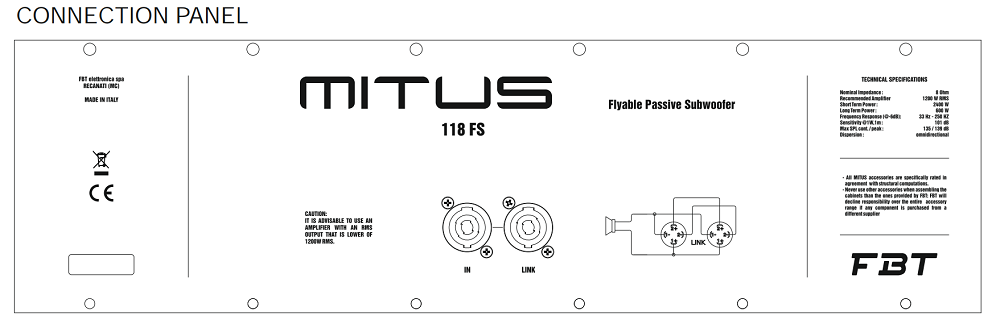 Характеристики сабвуфера MITUS 118FS: диапазон воспроизводимых частот 33 Гц - 250 Гц, диаграмма направленности всенаправленная. Чувствительность 101 дБ, максимальный уровень звукового давления SPL 139 дБ. Требуется подключение внешнего кроссовера! Подключается в низкоомные акустические линии с импедансом 8 Ом. Мощность составляет 1200 Вт, рекомендуется усилитель с выходной мощностью 1200 Вт. На тыльной стороне расположены коннекторы Neutrik Speacon NL4 MDV (2 шт).