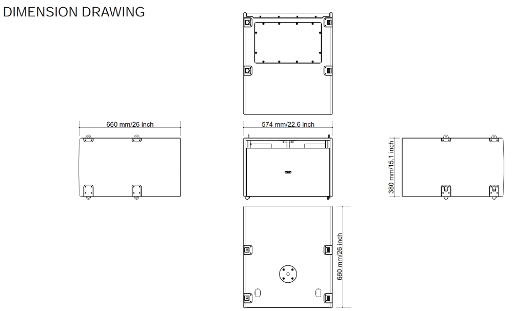 Корпус выполнен из многослойной фанеры балтийской березы толщиной 15 мм, стальная решетка с порошковым окрасом защищает лицевую часть. Габаритные размеры 574х420х660 мм, вес 35 кг. Монтаж напольный, на подвес или на акустические стойки (стакан с резьбой М20). Для удобства переноса предусмотрены ручки. Черный цвет.
