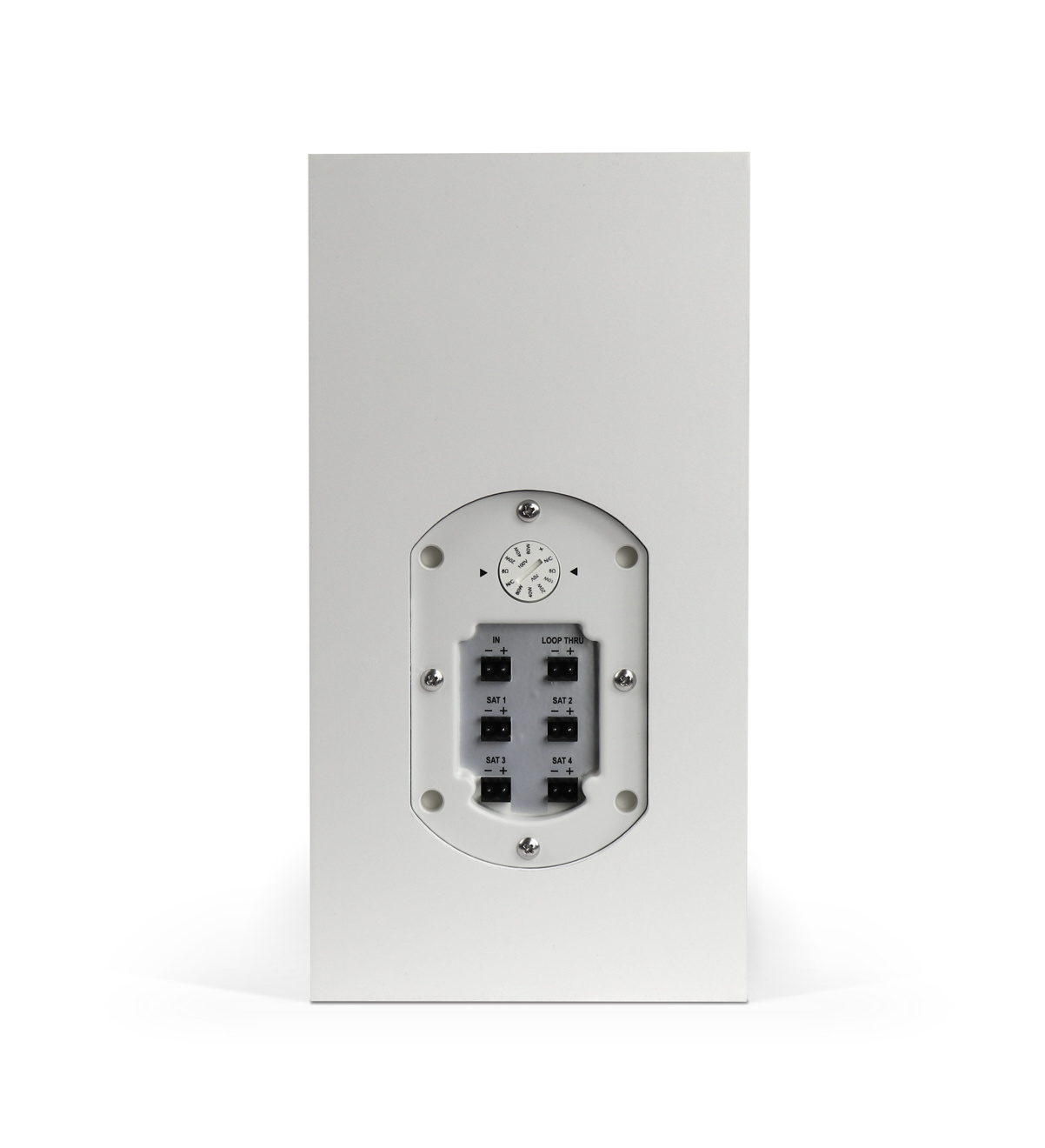 На боковой части АС, под крышкой размещён блок аудиоразъёмов и поворотный регулятор для отводов трансформатора. Корпус выполнен из МДФ, передняя часть защищена решеткой из стали. Габаритные размеры 290x150x350 мм, вес 8,8 кг. Установка на пол или на стену для чего в комплекте предусмотрен кронштейн. Белый цвет.