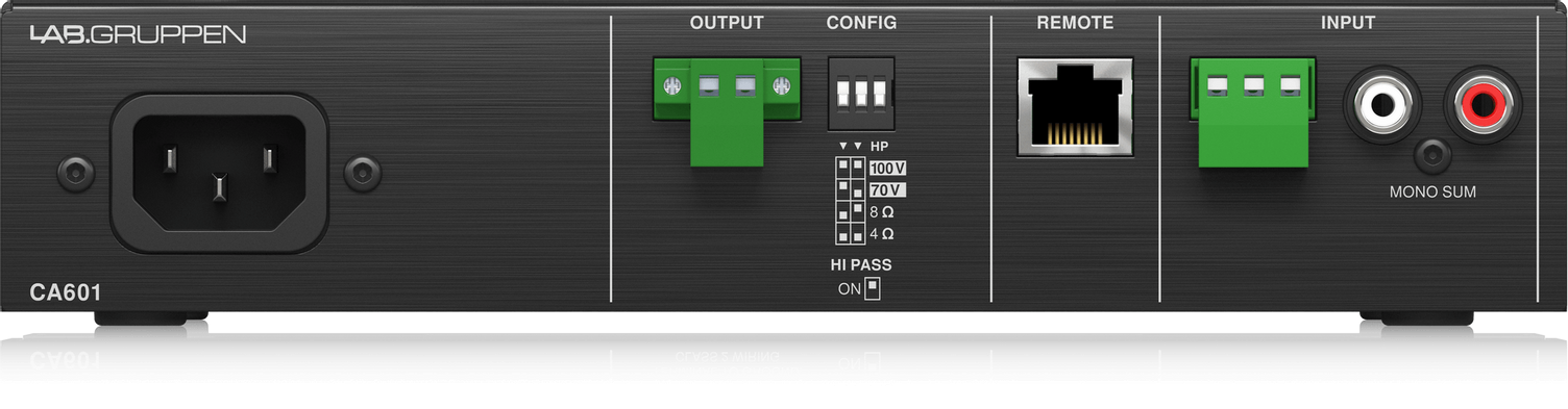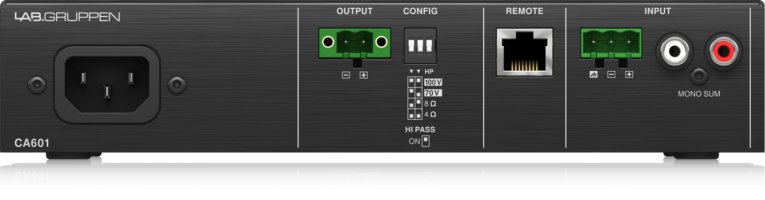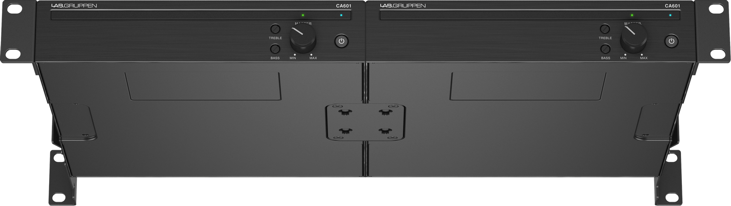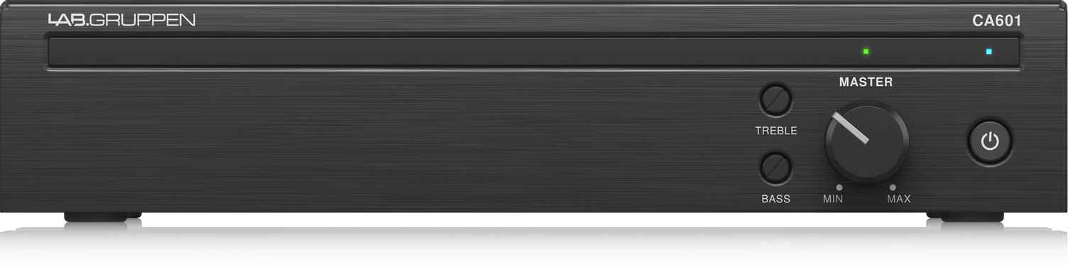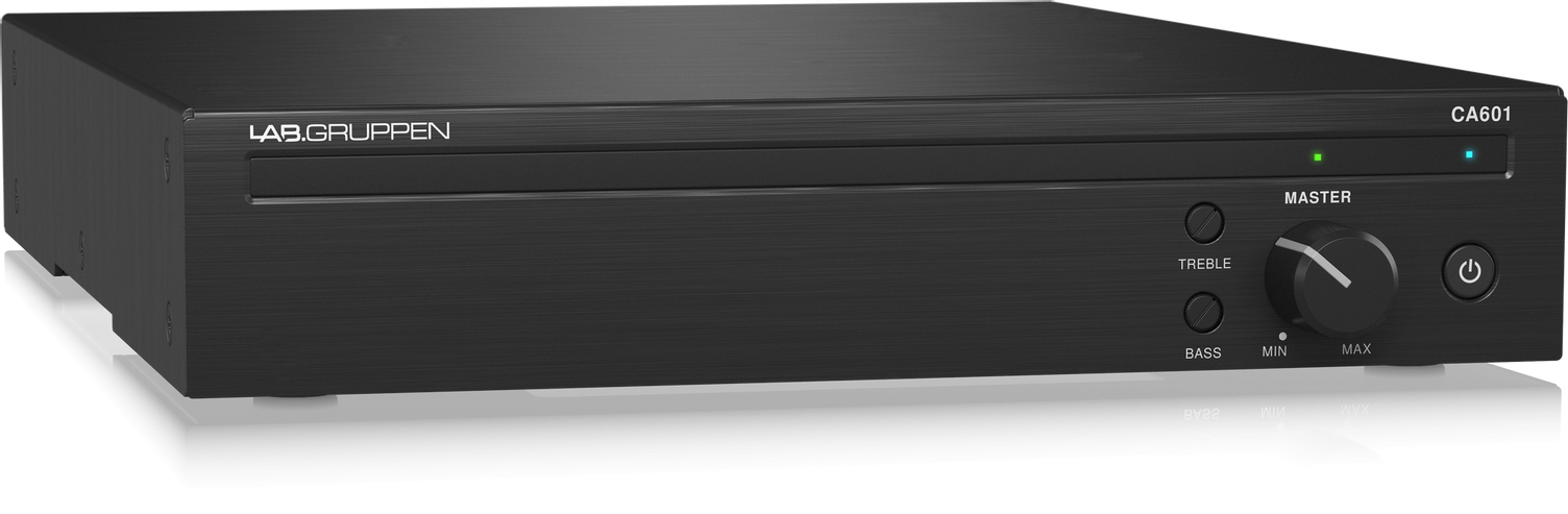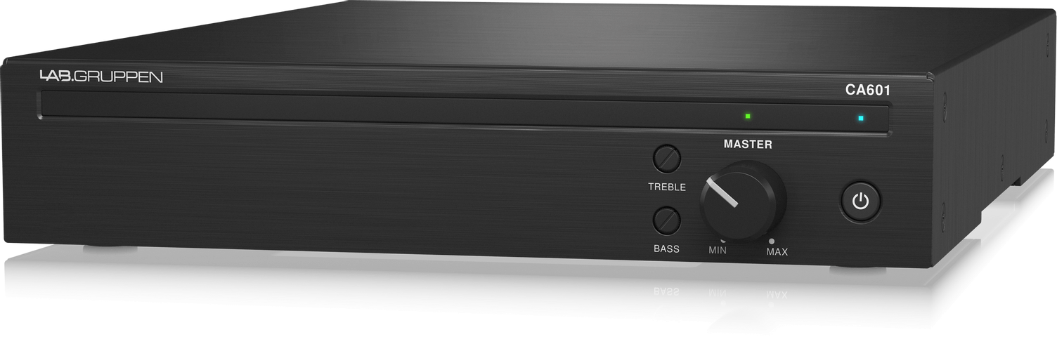 На лицевой панели размещены регуляторы громкости и двухполосный эквалайзер (ВЧ и НЧ) для каждого канала; тут же светодиодная индикация. Аудиовходы: 1х Euroblock 3-pin и 1х RCA (моно-сумма); аудиовыходы: 1х Euroblock 2-pin; для дистанционного управления громкостью есть разъем RJ-45, к которому подключается удаленная панель. Усилитель CA601 надежно защищен от короткого замыкания, перегрева, постоянного напряжения + есть лимитер. При отсутствии активности прибор автоматически переходит в режим ожидания с минимальным потреблением мощности.