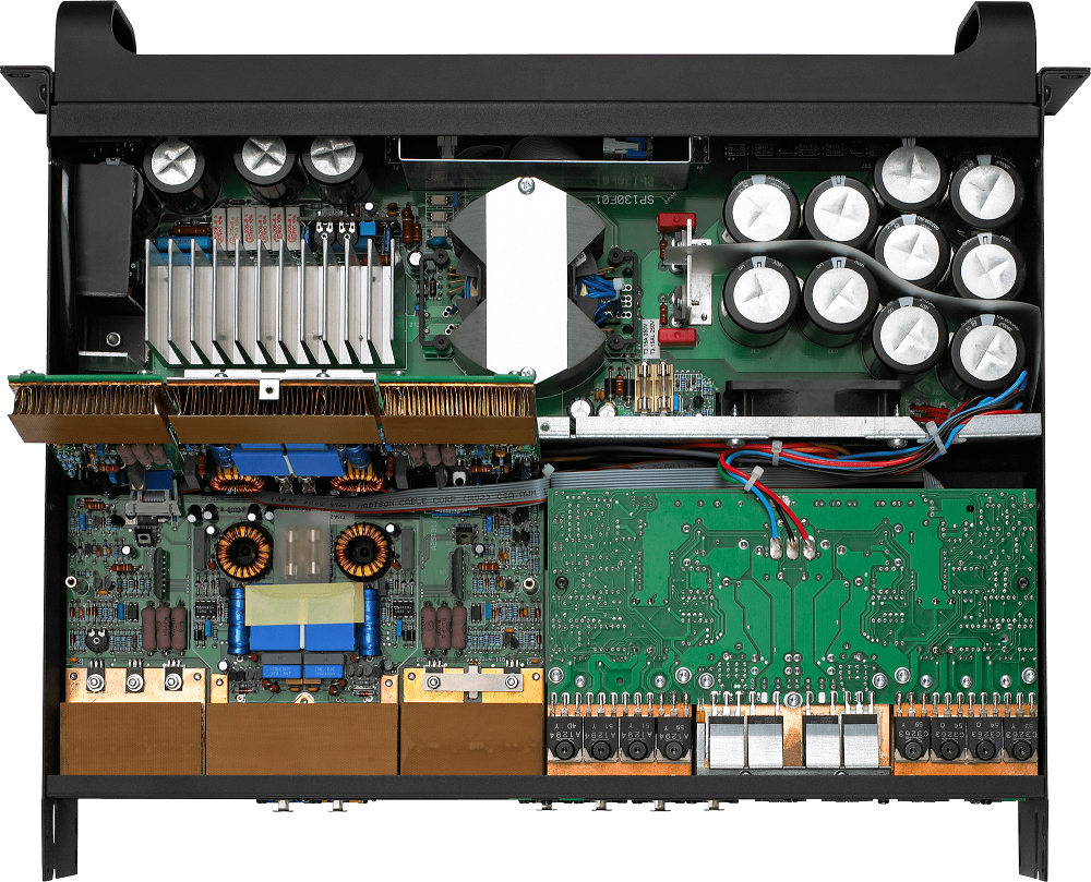 Четырехканальный усилитель класса D, подключение в низкоомные (импеданс 2-4-8-16 Ом) или трансляционные (напряжение 70/100В) линии. Режим работы каждого канала настраивается отдельно. Выходная мощность зависит от типа подключения и количества активных каналов, варьируется в диапазоне 1150 - 8800 Вт. Встроенный аудиопроцессор DSP Lake (АЦП/ЦАП 48/96 кГц, 32 бит): 4 пресета и микшеринг сигналов со входов на выходы. Частотный диапазон 20 Гц - 20 кГц. Аналоговые аудиовходы: 4х Euroblock 3-pin; цифровые аудиовходы: 2х AES3 (Euroblock 3-pin); аудиовыходы 4х 2-х полюсных клеммников; 8 вх/вых каналов DANTE (2х RJ-45). Питание ~ 220 В, два вентилятора, автоматический ждущий режим. Габаритные размеры 483x88x463 мм; рэковый размер 2U, вес 16.5 кг.