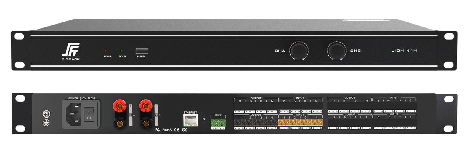 Двухканальный усилитель мощности S-Track LION 44N - это цифровое устройство, предназначенное для работы с низкоомной акустикой (импеданс линии 8 Ом). Выходная мощность 2х 145 Вт. Для того, чтобы существенно улучшить параметры передаваемого акустического сигнала, усилитель оснащён цифровым аудиопроцессором (DSP): чип Ti 456 МГц FLOPS DSP, АЦП/ЦАП 24 бит/48 кГц, Встроенный микшер, системы автоматического подавления эха (AEC), шума (ANC) и обратной связи (AFC). Прекрасно подходит для эксплуатации в залах для конференций и выставок, проведения мероприятий, публичных выступлений, лекций, видеоконференций и т.п.