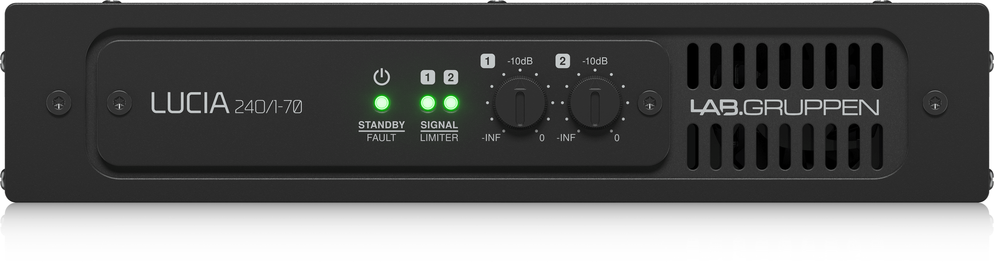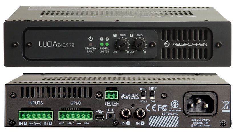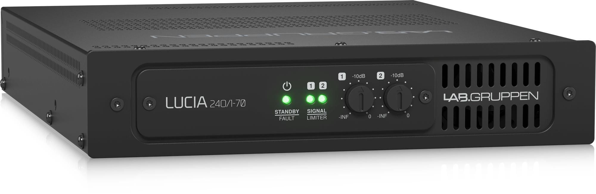 LUCIA 240/1-70 - это компактный одноканальный усилитель со встроенным аудиопроцессором (DSP) из серии усилителей LUCIA производства компании LAB.GRUPPEN, Швеция. Для своих размеров обладает прекрасными характеристиками и высокой точностью мощности. Отлично подойдет для построения небольшой системы звукофикации коммерческих объектов: кафе, бары, магазины, учебные комнаты и т.п. Рабочий диапазон частот 5 Гц - 22 кГц.