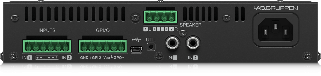 Аудиовходы: балансные 2х Euroblock 3-pin и небалансные 2х RCA; аудиовыход на акустику - 2х Euroblock 2-pin. Контакты расположены на тыльной части корпуса. Лицевая панель: регуляторы усиления для каждого из двух аудиовходов и светодиодная индикация. Защита от перегрузки по току, постоянного напряжения, КЗ и перегрева. Питание от сети ~220В, для охлаждения используются бесшумные вентиляторы. Автоматический переход в ждущий режим с пониженным энергопотреблением при отсутствии активности в течение 20 минут.