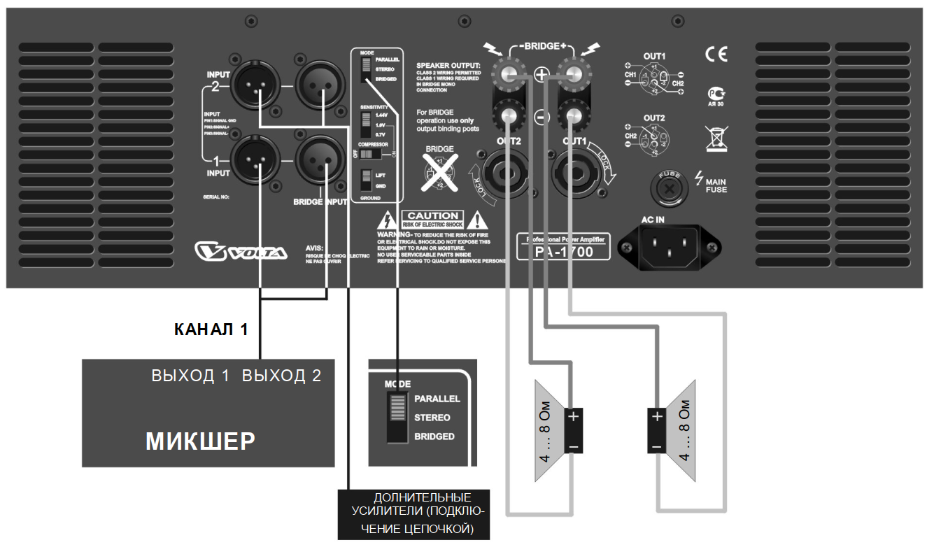 Усилитель PА-1700 оснащен линейными аудиовходами на разъемах 4х XLR 3-pin (2 прямых и 2 мостовых), входное сопротивление 10 кОм. Аудиовыходами на акустические системы выступают 2 разъема SpeakON и 2 пары винтовых клемм. Коннекторы, как и переключатели описанные выше, размещены на тыльной части корпуса. Тут же вентиляционные отверстия двух вентиляторов, которые отвечают за интеллектуальное охлаждение, автоматически регулируя скорость вращения в зависимости от температуры. На лицевой панели расположены 2 независимых регулятора уровня сигнала для каждого из каналов, а также светодиодные индикаторы: перегрузка, короткое замыкание, вход в мостовой или параллельный режим. Защита короткого замыкания, постоянного тока, перегрева, инфра и ультразвуковые фильтры, радиочастотный фильтр и функция мягкого старта.
