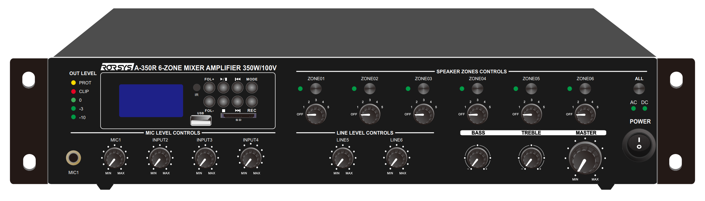 A-350R - это зональный микшер-усилитель производства компании RORSYS. Обладает отличными характеристиками, высокой точностью мощности и встроенным медиаплеером, что позволяет создавать на его базе разветвленные системы музыкально-речевых трансляций с вещанием в нескольких зонах (до 6) на различных объектах: рестораны и кафе, АЗС, магазины, лобби отелей, ТРЦ, банковские и офисные помещения, залы ожидания и т.д., и т.п.