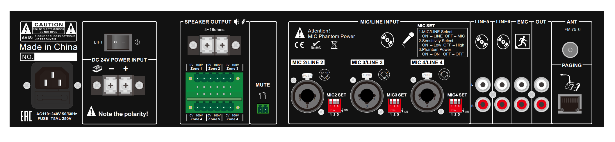 Отдельно надо отметить исполнительное реле типа "Mute" и линейный вход EMC. Нормально-открытое реле, тип "сухой контакт", поступление управляющего сигнала блокирует трансляцию со всех входов, кроме MIC1. Линейный вход EMC обладает максимальным приоритетом и прерывает любое вещание. Данный функционал позволяет подключать усилитель в локальные ОПС или федеральную систему ГО и ЧС.