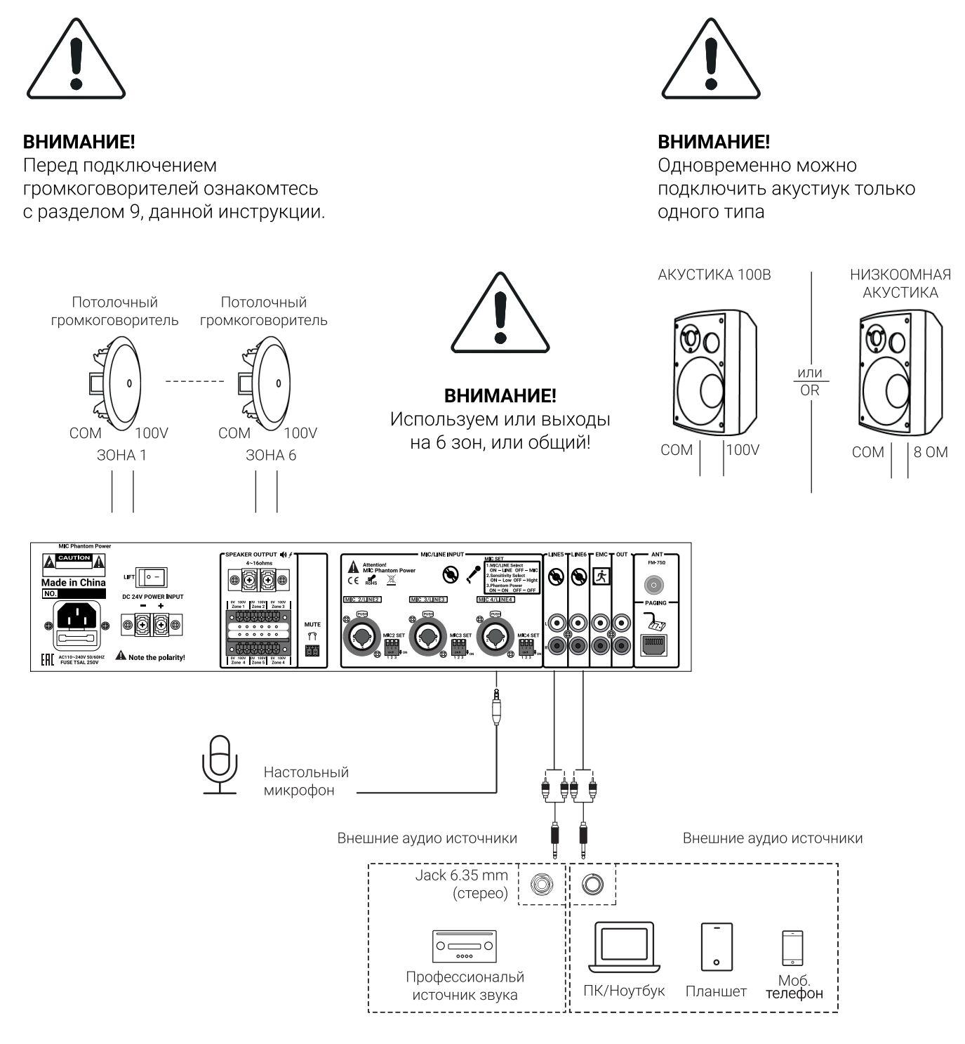 | Напряжение в линии: | 70 / 100 В (доступно зональное вещание) |