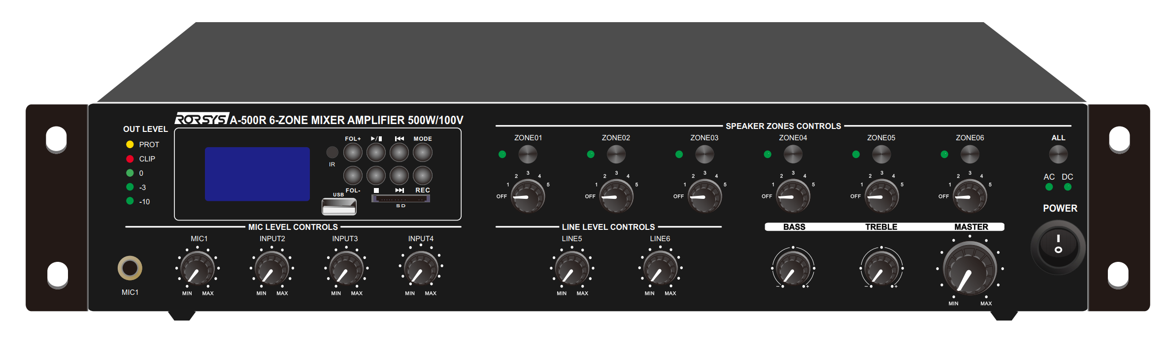 A-500R - это зональный микшер-усилитель производства компании RORSYS. Обладает отличными характеристиками, высокой точностью мощности и встроенным медиаплеером, что позволяет создавать на его базе разветвленные системы музыкально-речевых трансляций с вещанием в нескольких зонах (до 6) на различных объектах: рестораны и кафе, АЗС, магазины, лобби отелей, ТРЦ, банковские и офисные помещения, залы ожидания и т.д., и т.п.