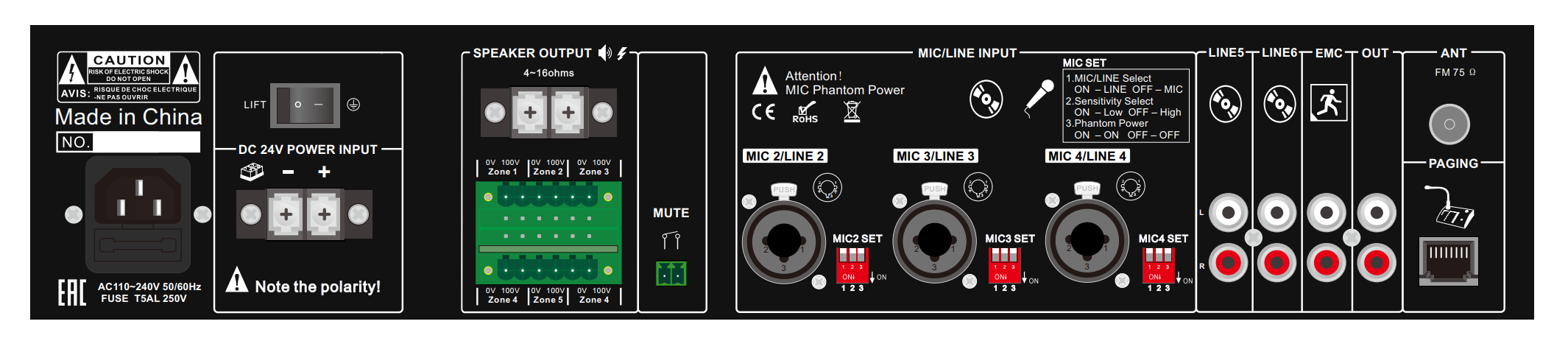 Отдельно надо отметить исполнительное реле типа "Mute" и линейный вход EMC. Нормально-открытое реле, тип "сухой контакт", поступление управляющего сигнала блокирует трансляцию со всех входов, кроме MIC1. Линейный вход EMC обладает максимальным приоритетом и прерывает любое вещание. Данный функционал позволяет подключать усилитель в локальные ОПС или федеральную систему ГО и ЧС.