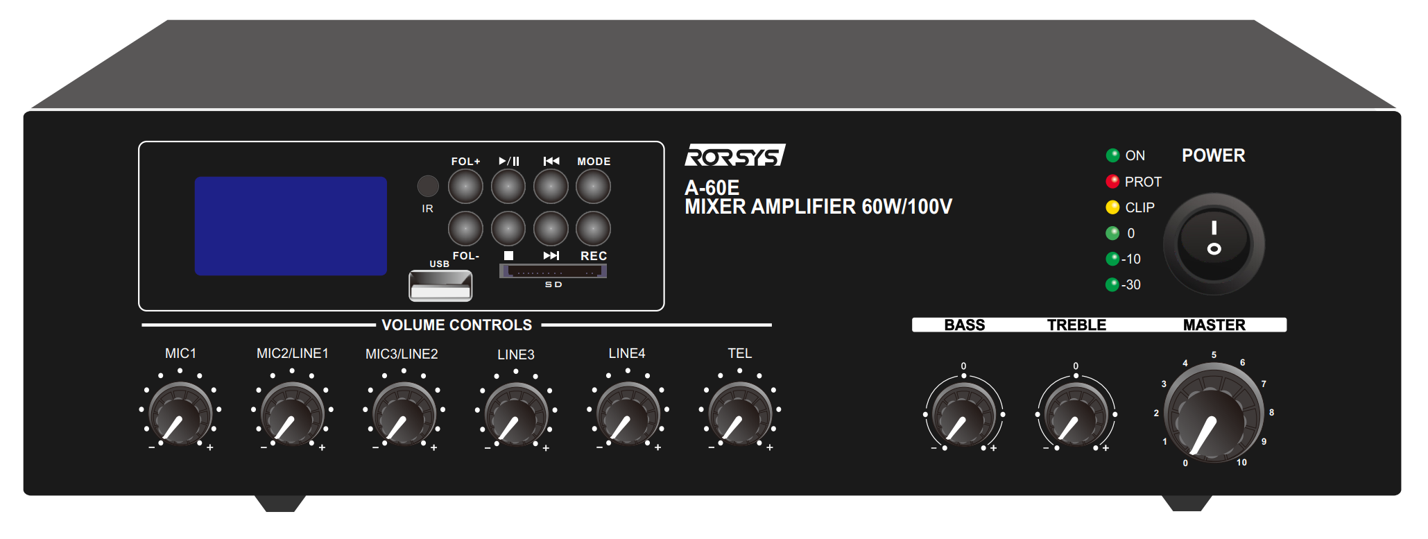 A-60E - это микшер-усилитель производства компании RORSYS. Обладает достойными характеристиками, хорошей точностью мощности и встроенным медиаплеером, что позволяет создавать на его базе системы музыкально-речевых трансляций для различных небольших объектов: залы ресторанов и кафе, АЗС, магазины, лобби отелей, банковские помещения, залы ожидания и т.д., и т.п.