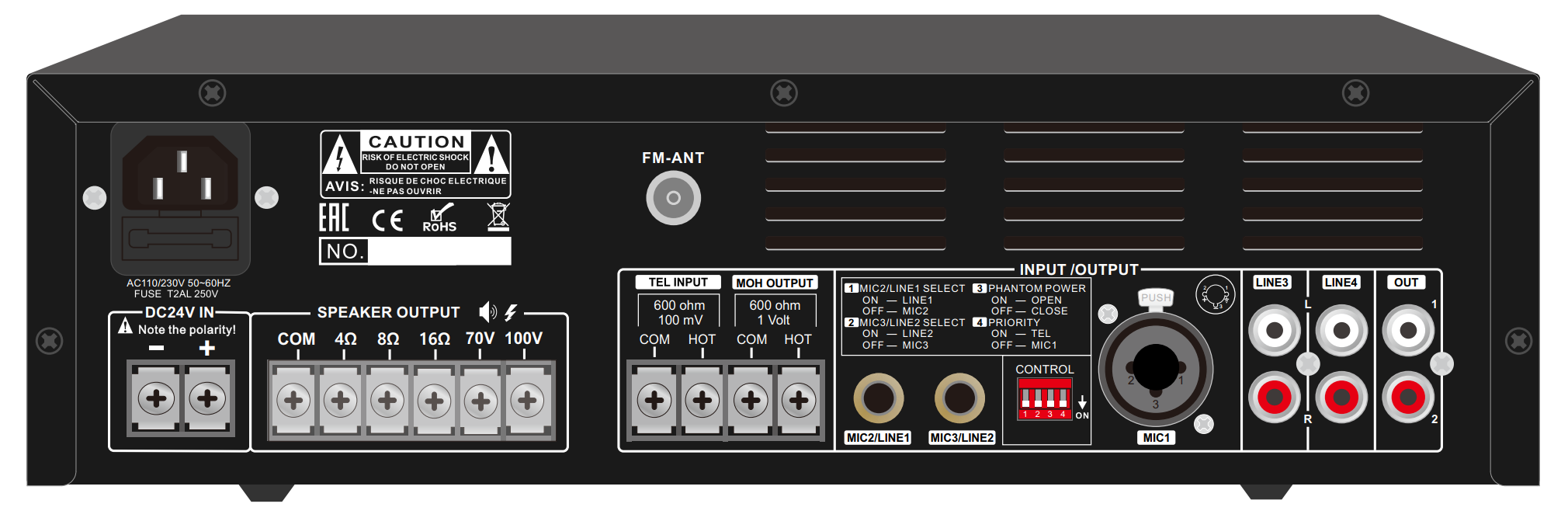 Особенностью является возможность интеграции усилителя в телефонную сеть с помощью винтовых клемм TEL INPUT, а также выход MOH OUTPUT для осуществления возможности транслировать музыку вместо звонка во время ожидания ответа с данного входа.